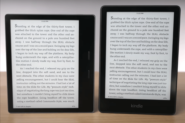 Das Display des Paperwhite misst in der Diagonale 6,8 Zoll, also 17,27cm und das des Oasis 17,78cm bzw. 7 Zoll. Allzu groß ist der Unterschied in unseren Augen nicht, aber es sind immerhin 2% Differenz, die für manch einen ausschlaggebend sein können.